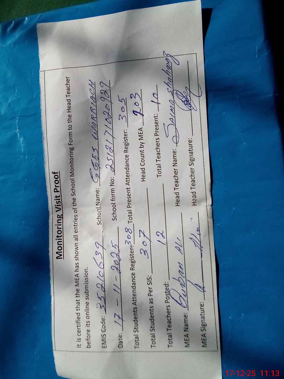 | Attendance Register | Head Teacher | MEA with School | Visit Proof |