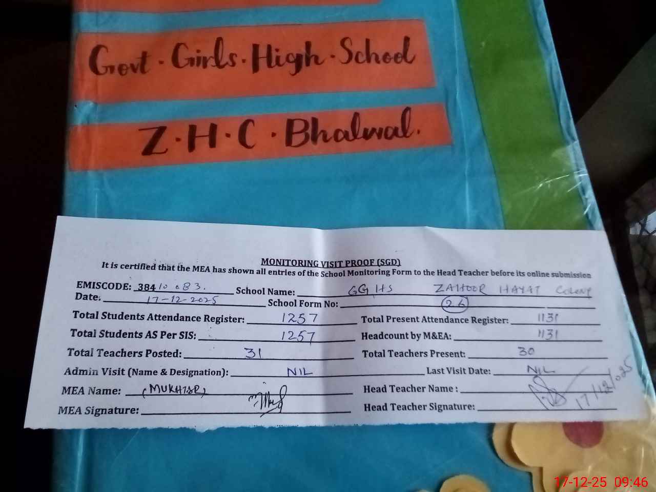 | EMIS Code: 38410083 | Name of School: GGHS ZAHOOR HAYAT COLONY BHALWAL | |||