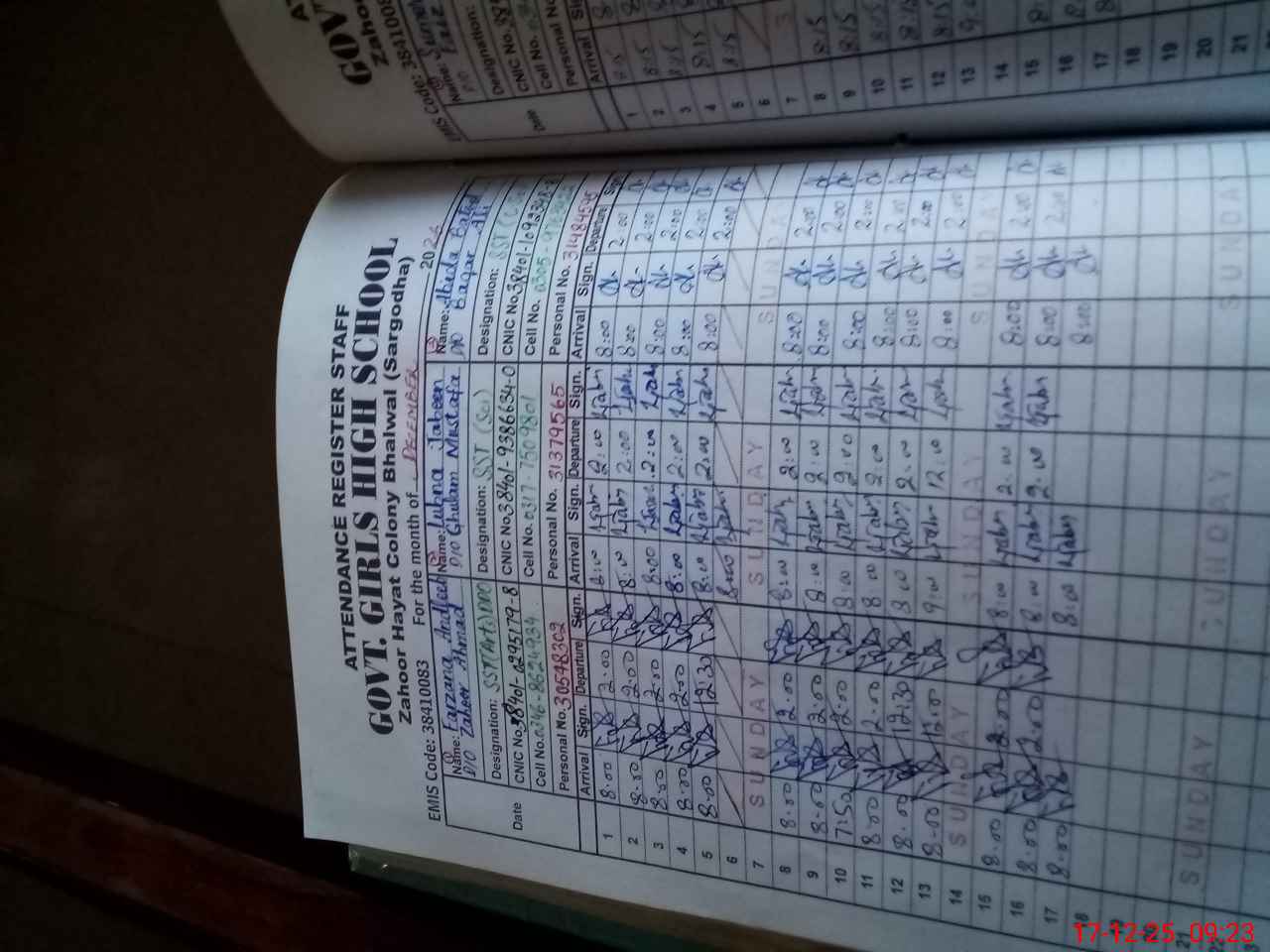 | CNIC | Full Name | Designation | R/C | Absence during last cal. month |