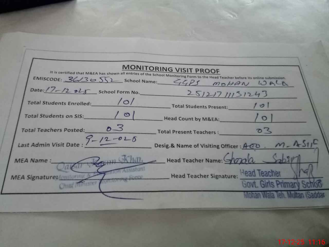 | EMIS Code: 36130552 | Name of School: GGPS MOHAN WALA MULTAN | |||