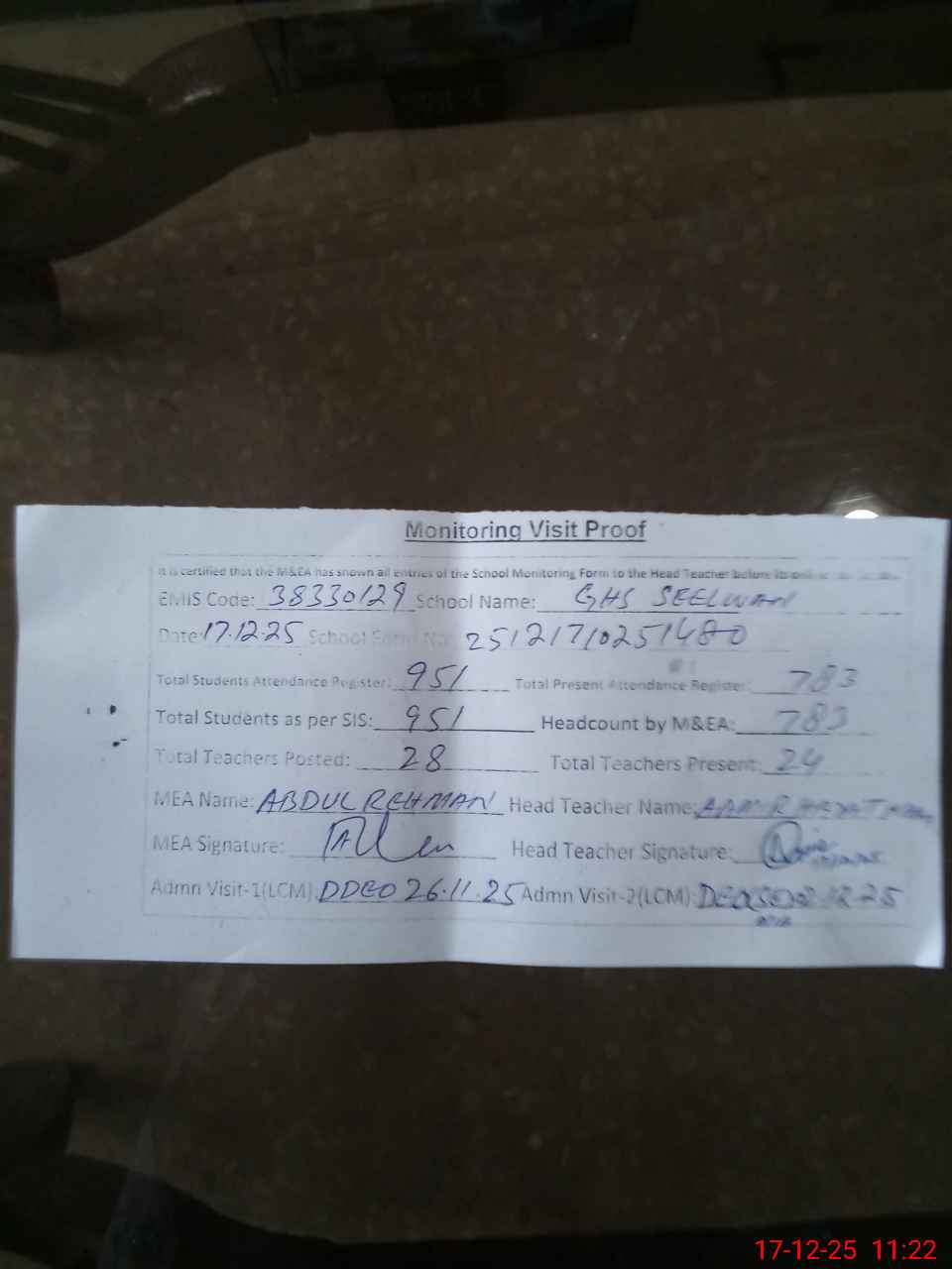 | Attendance Register | Head Teacher | MEA with School | Visit Proof |