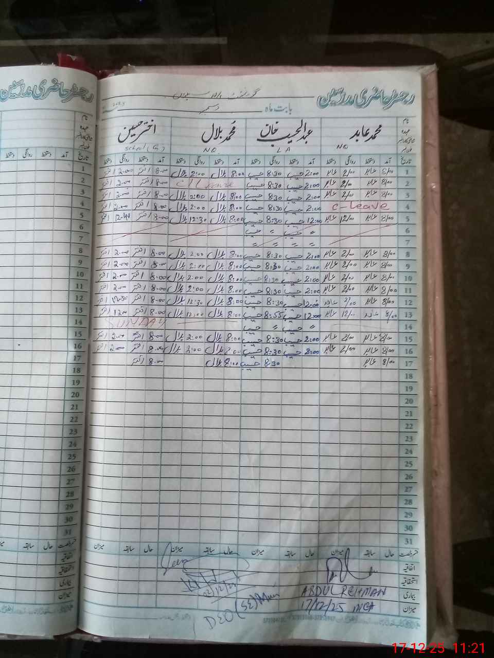 | CNIC | Full Name | Designation | R/C | Absence During Last Calender Month |