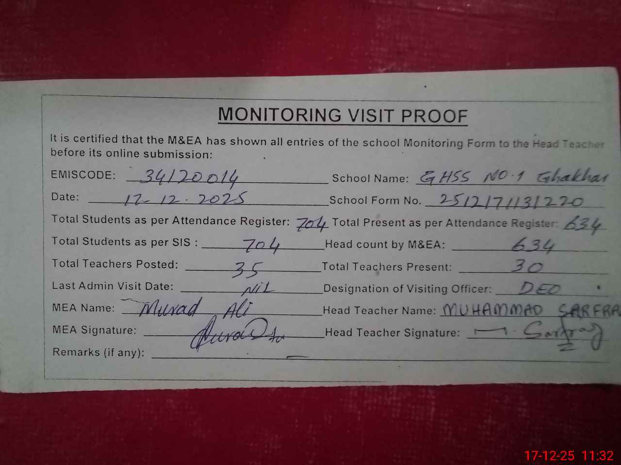 | EMIS Code: 34120014 | Name of School: GHSS NO.1 GHAKHAR | |||