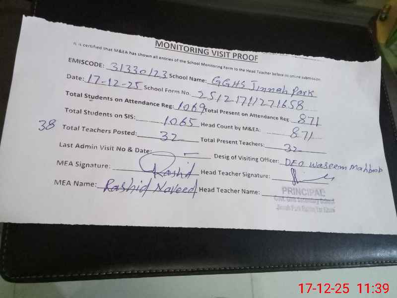 | Attendance Register | Head Teacher | MEA with School | Visit Proof |