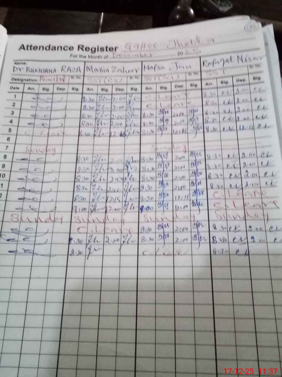 | CNIC | Full Name | Designation | R/C | Absence During Last Calender Month |