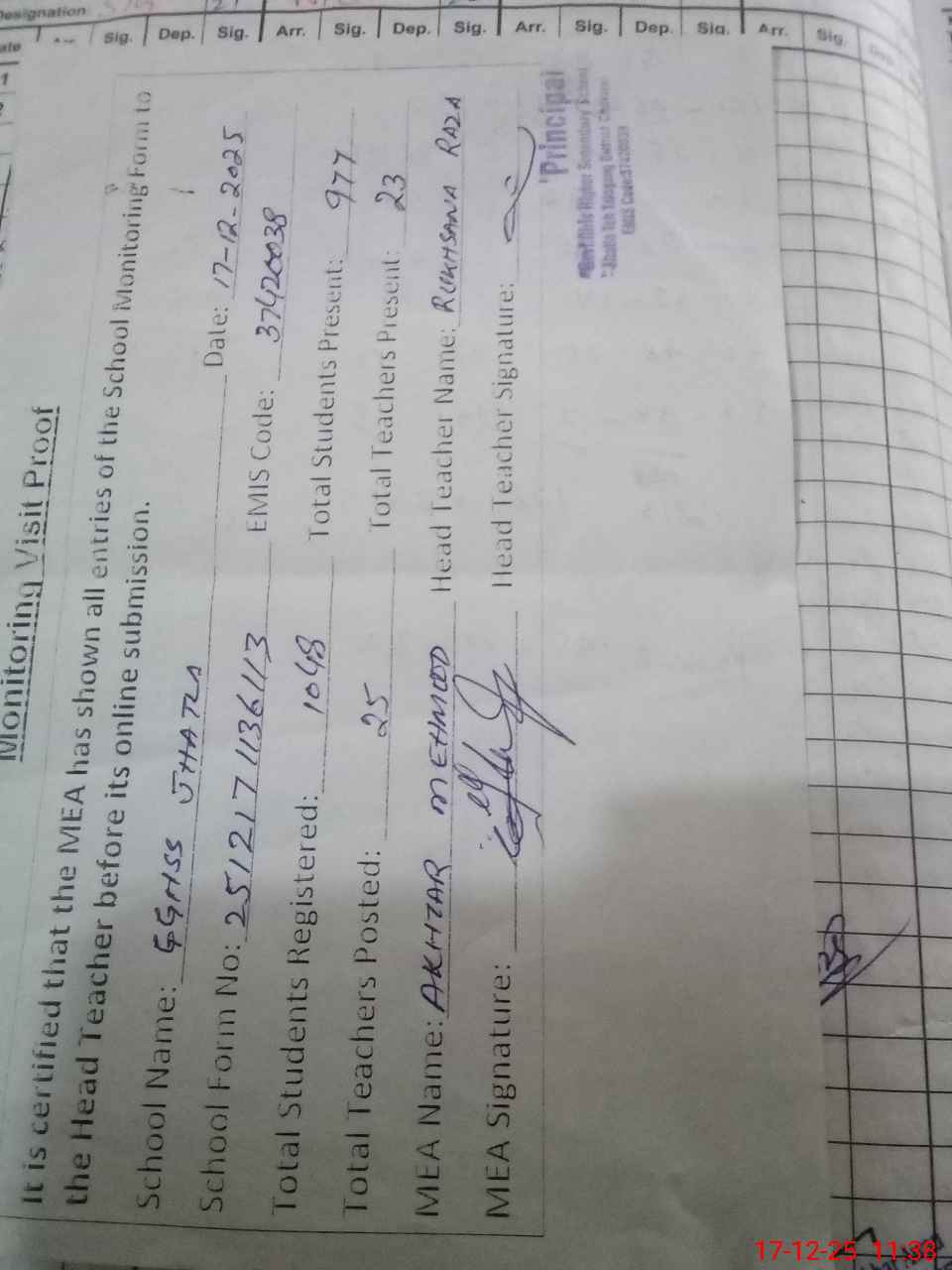 | Attendance Register | Head Teacher | MEA with School | Visit Proof |