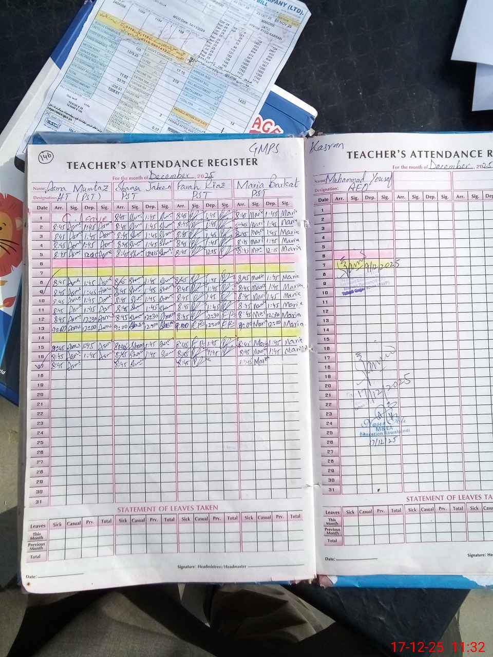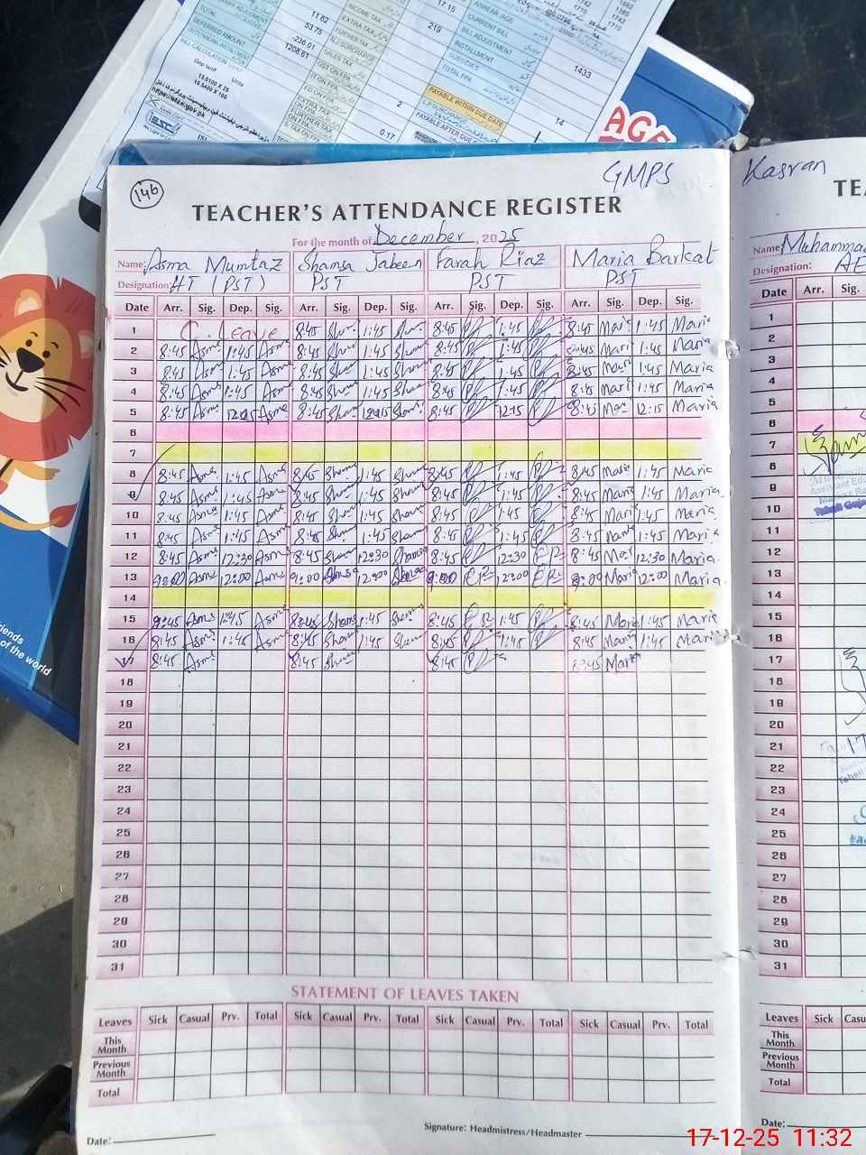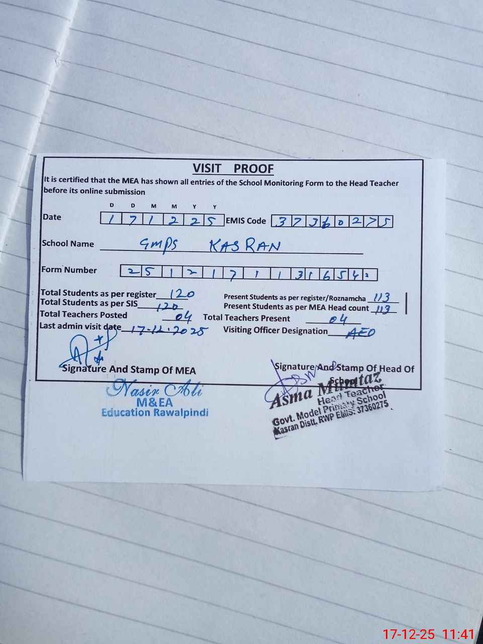 | Attendance Register | Head Teacher | MEA with School | Visit Proof |