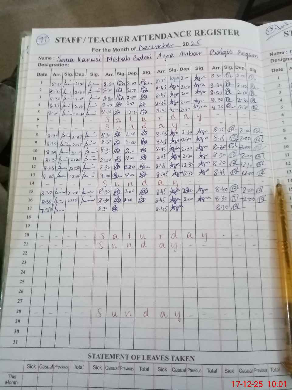 | CNIC | Full Name | Designation | R/C | Absence During Last Calender Month |