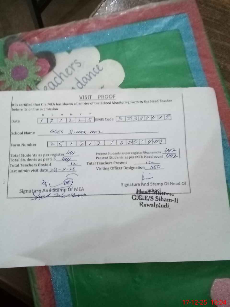 | Attendance Register | Head Teacher | MEA with School | Visit Proof |