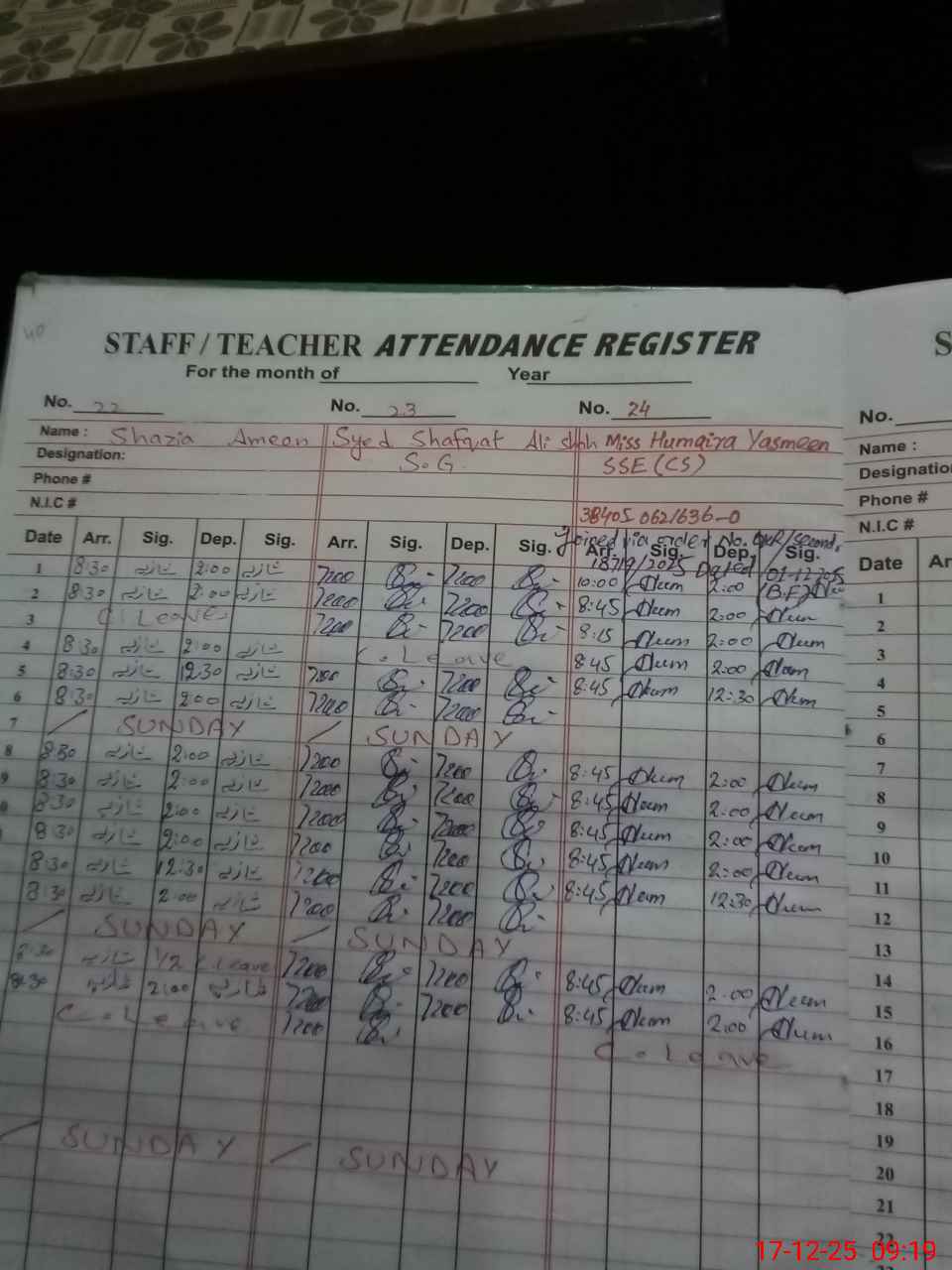 | CNIC | Full Name | Designation | R/C | Absence during last cal. month |