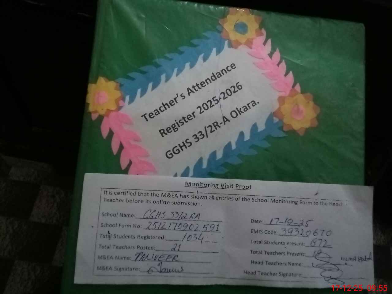 | Attendance Register | Head Teacher | MEA with School | Visit Proof |