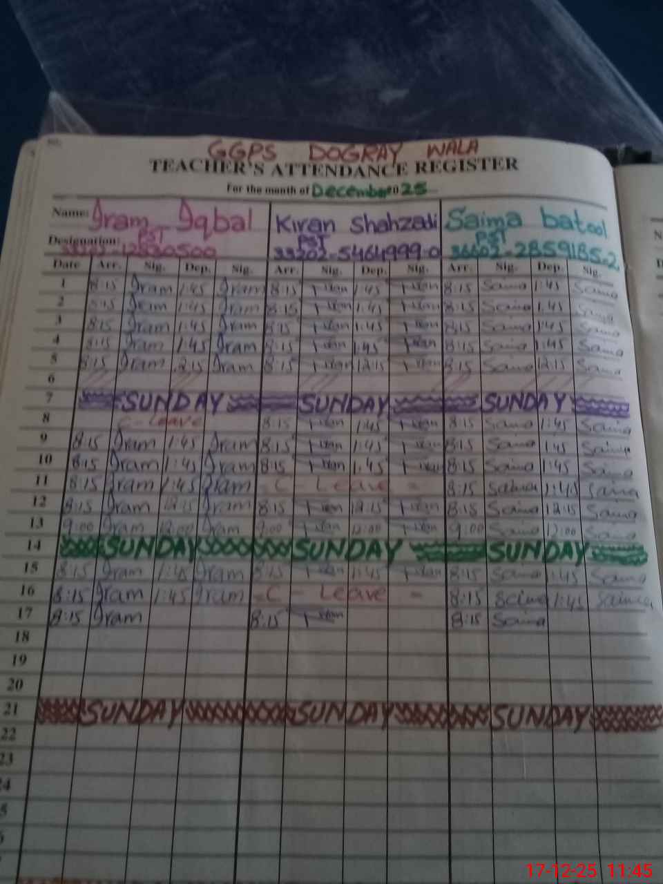 | CNIC | Full Name | Designation | R/C | Absence During Last Calender Month |