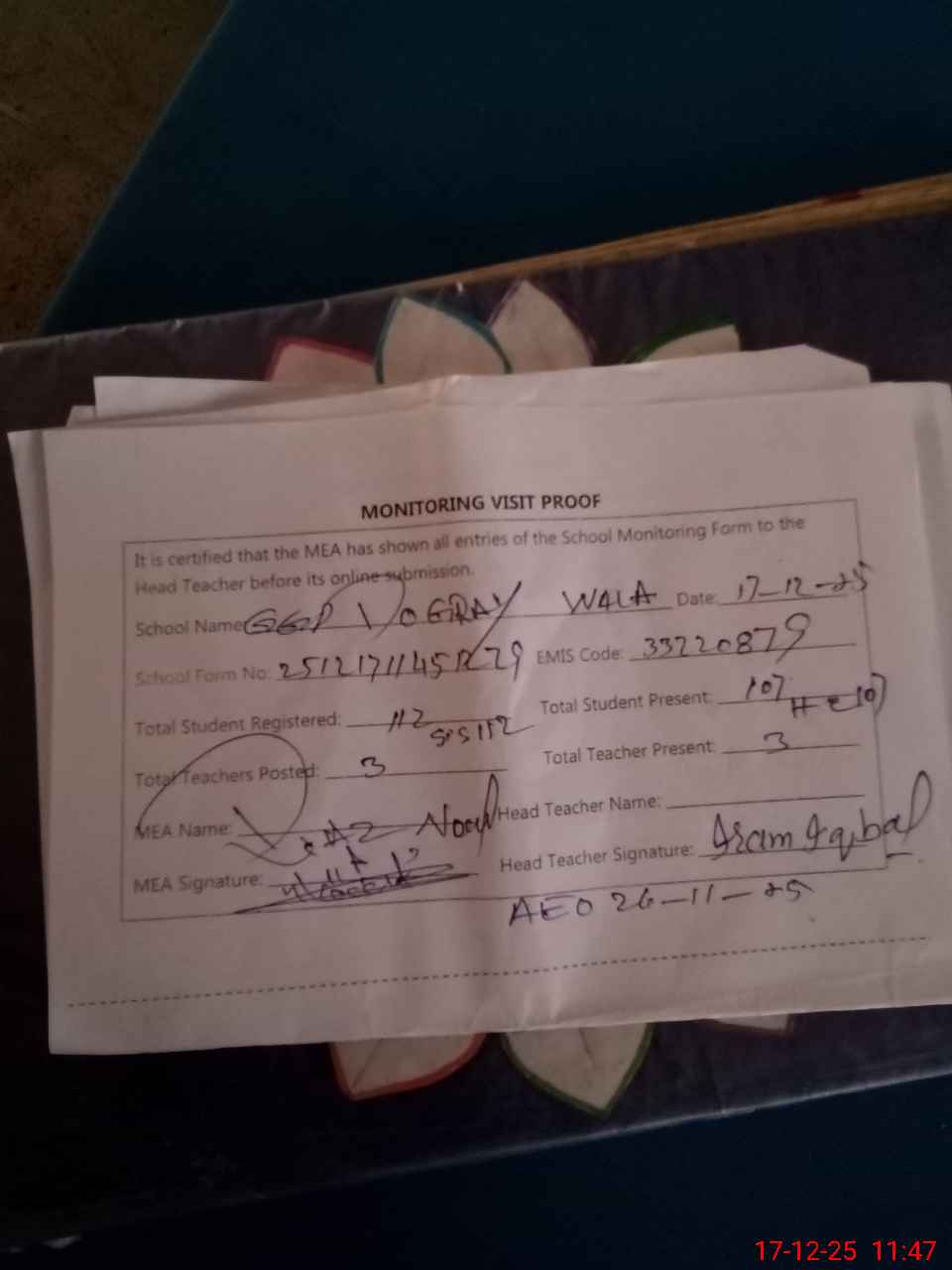 | Attendance Register | Head Teacher | MEA with School | Visit Proof |