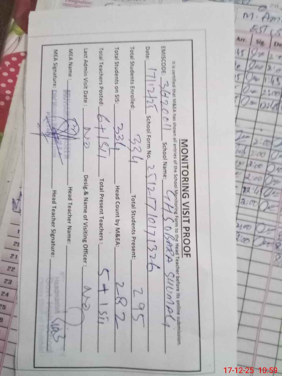 | Monitoring Date: 17-12-2025 | Start Time: 17-12-2025 10:17 AM | End Time: 17-12-2025 10:59 AM | Name of MEA: MU**** YA**** | |