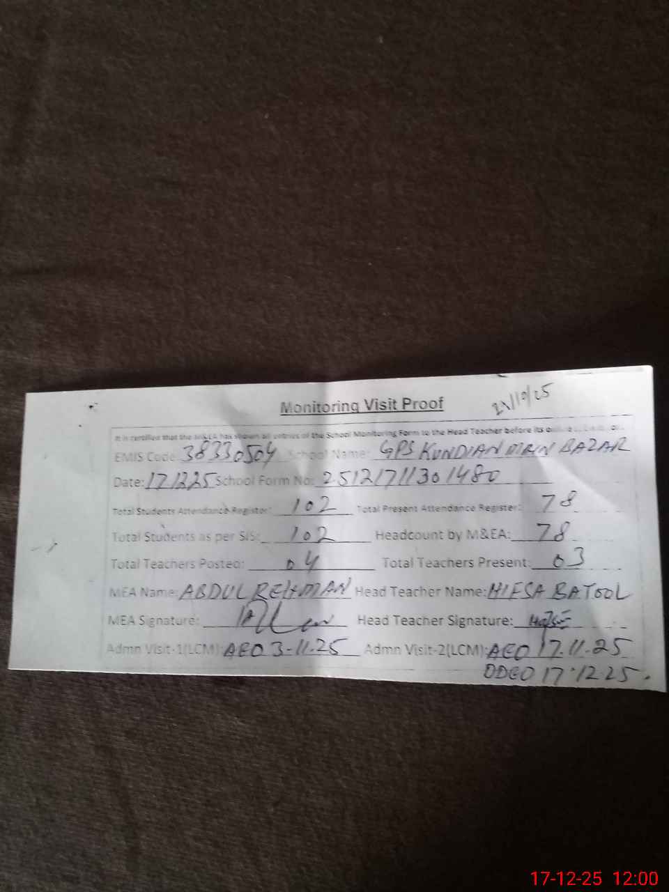 | EMIS Code: 38330504 | Name of School: GPS KUNDIAN STATION MAIN BAZAR | |||