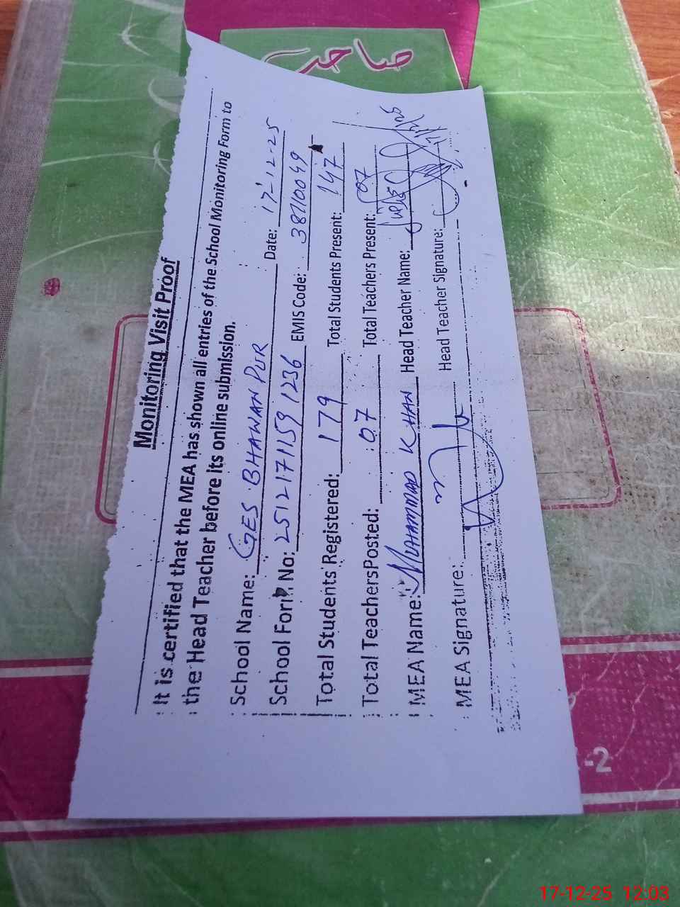 | Attendance Register | Head Teacher | MEA with School | Visit Proof |