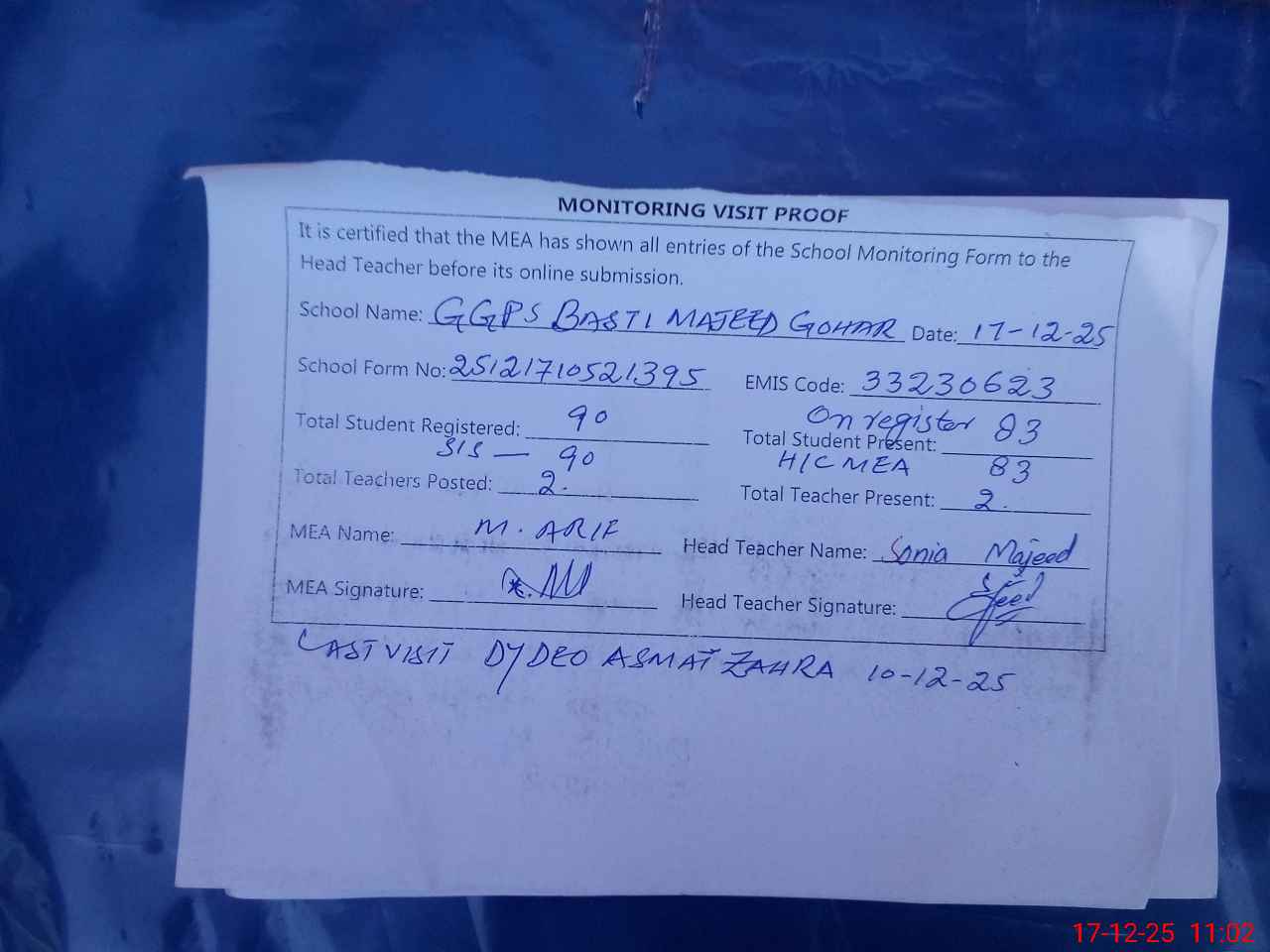 | EMIS Code: 33230623 | Name of School: GGPS BASTI MAJEED GOHAR | |||