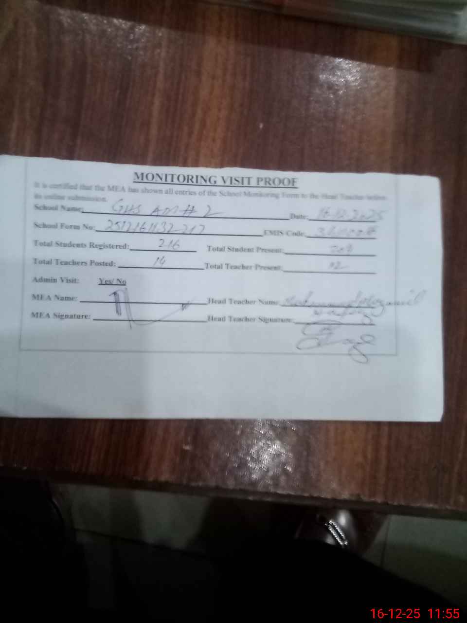| Attendance Register | Head Teacher | MEA with School | Visit Proof |