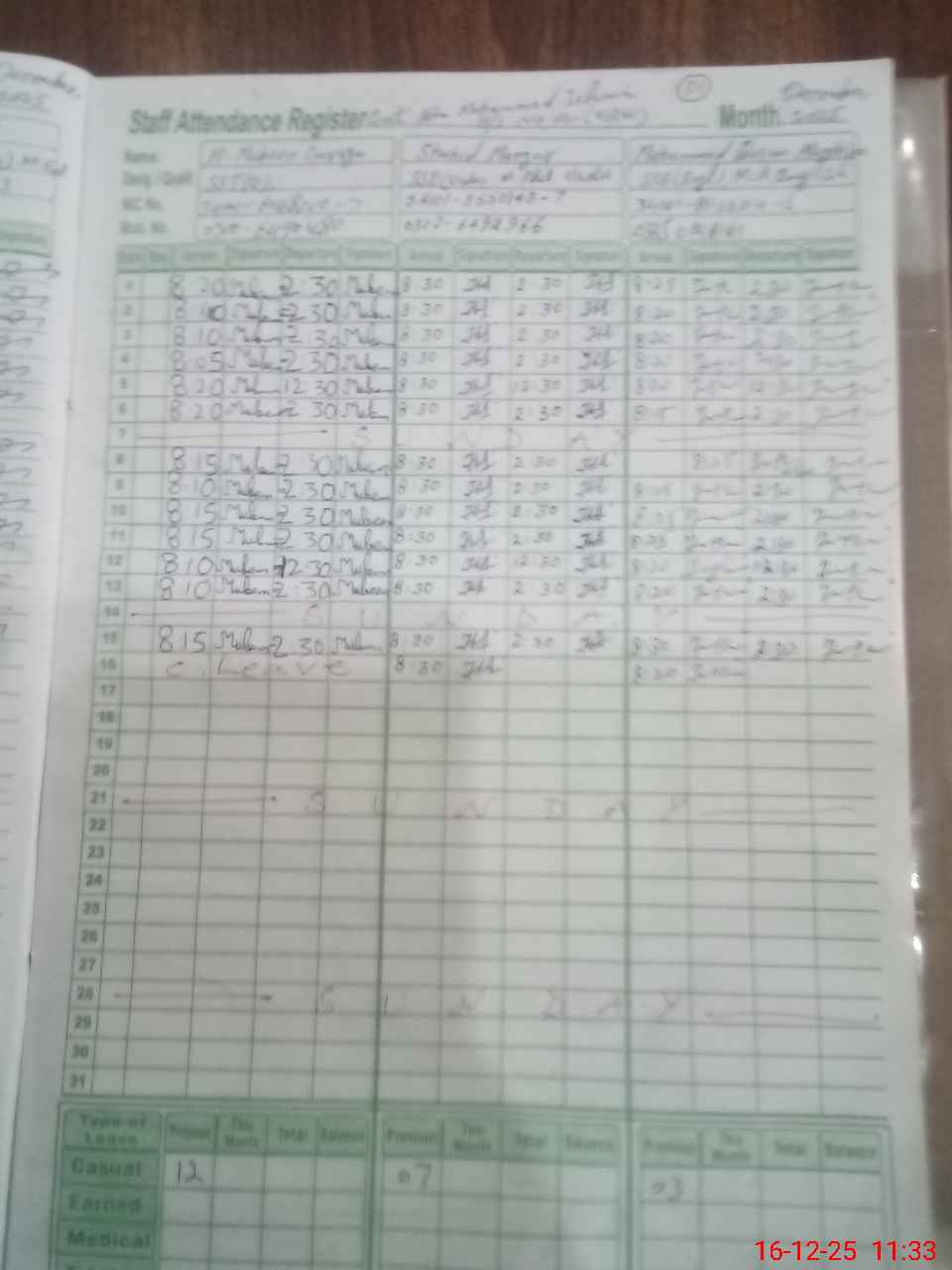 | CNIC | Full Name | Designation | R/C | Absence During Last Calender Month |