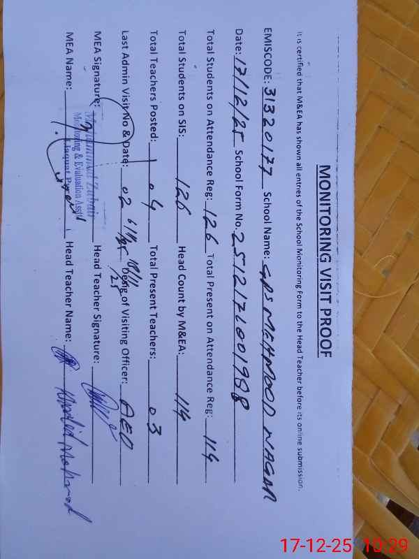 | Attendance Register | Head Teacher | MEA with School | Visit Proof |