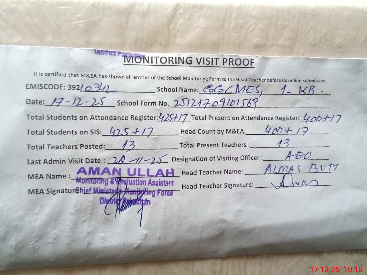 | EMIS Code: 39210342 | Name of School: GGCMES 1 KB PAKPATTAN | |||
