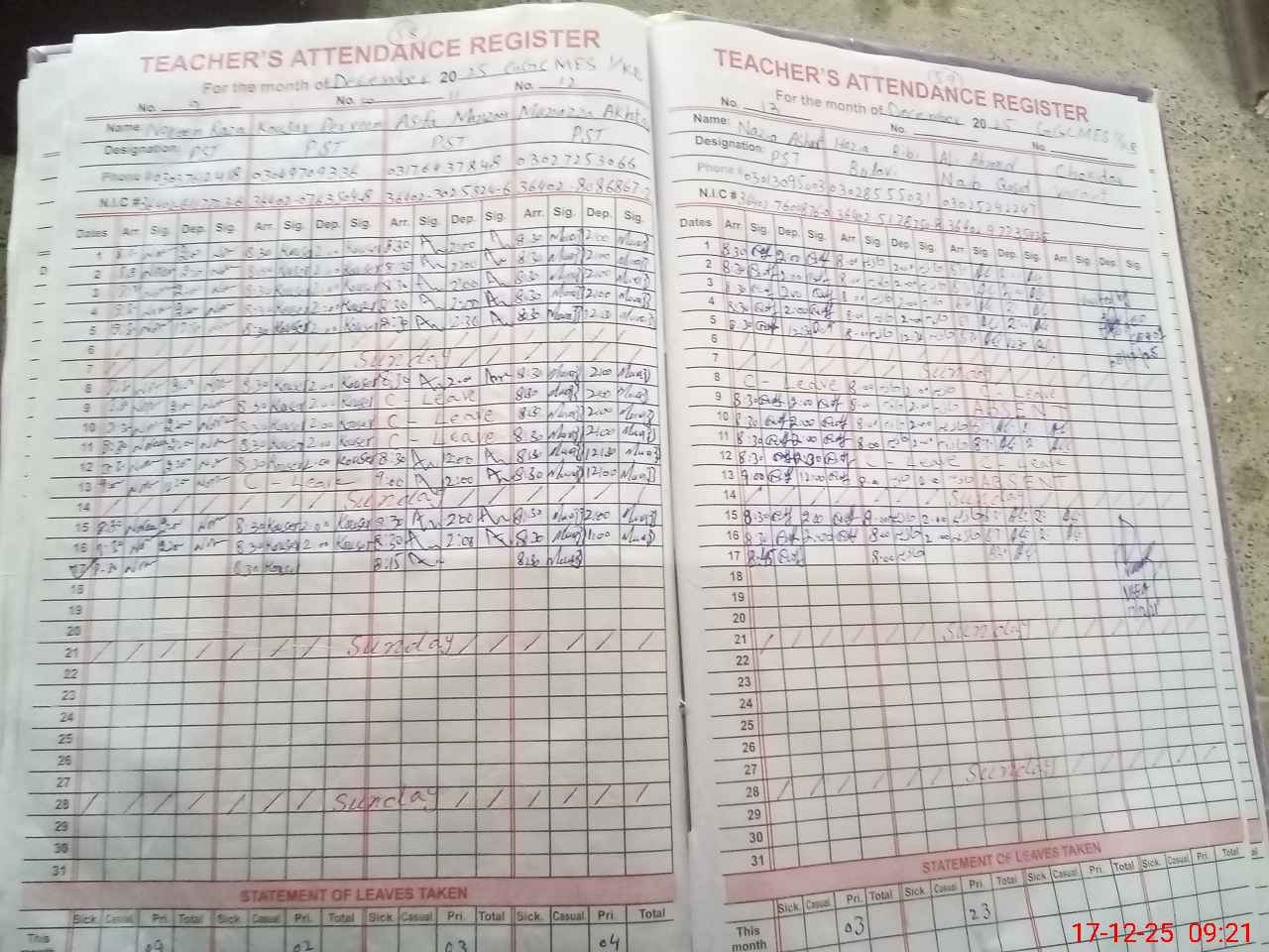 | CNIC | Full Name | Designation | R/C | Absence During Last Calender Month |