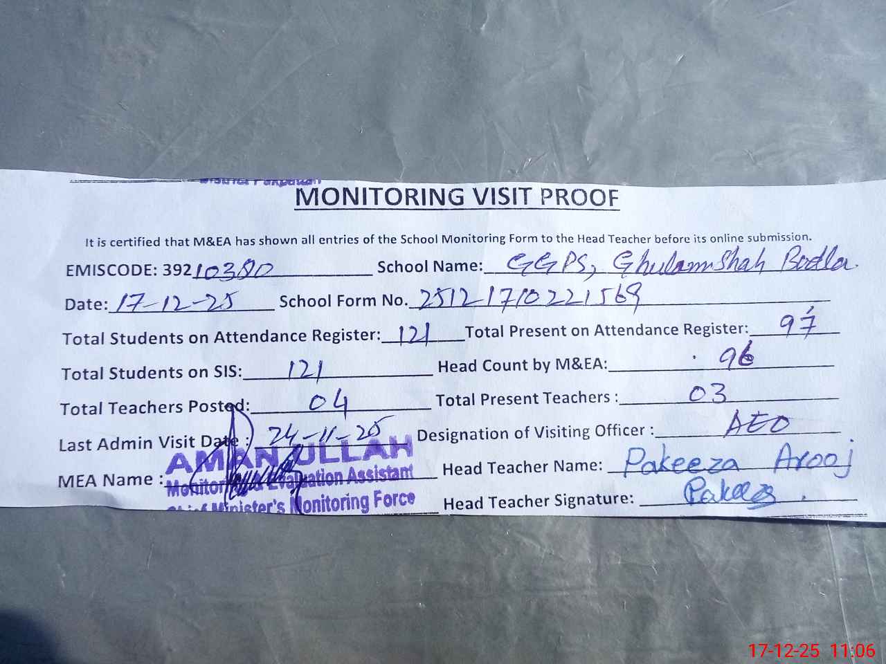 | EMIS Code: 39210380 | Name of School: GGPS GHULAM SHAH BOUDLA | |||