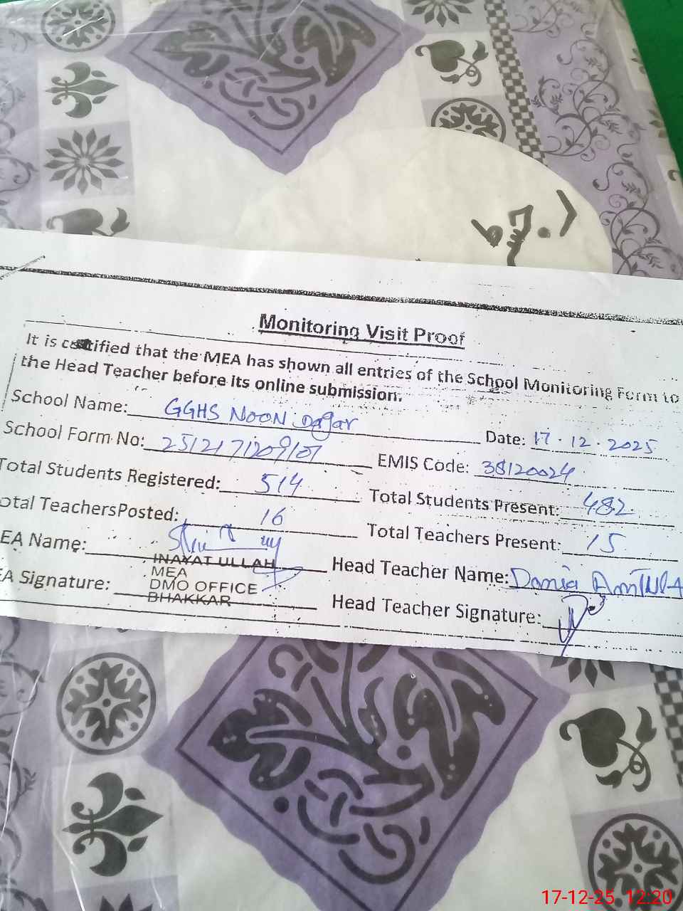 | EMIS Code: 38120024 | Name of School: GGHS DAGAR NOON | |||