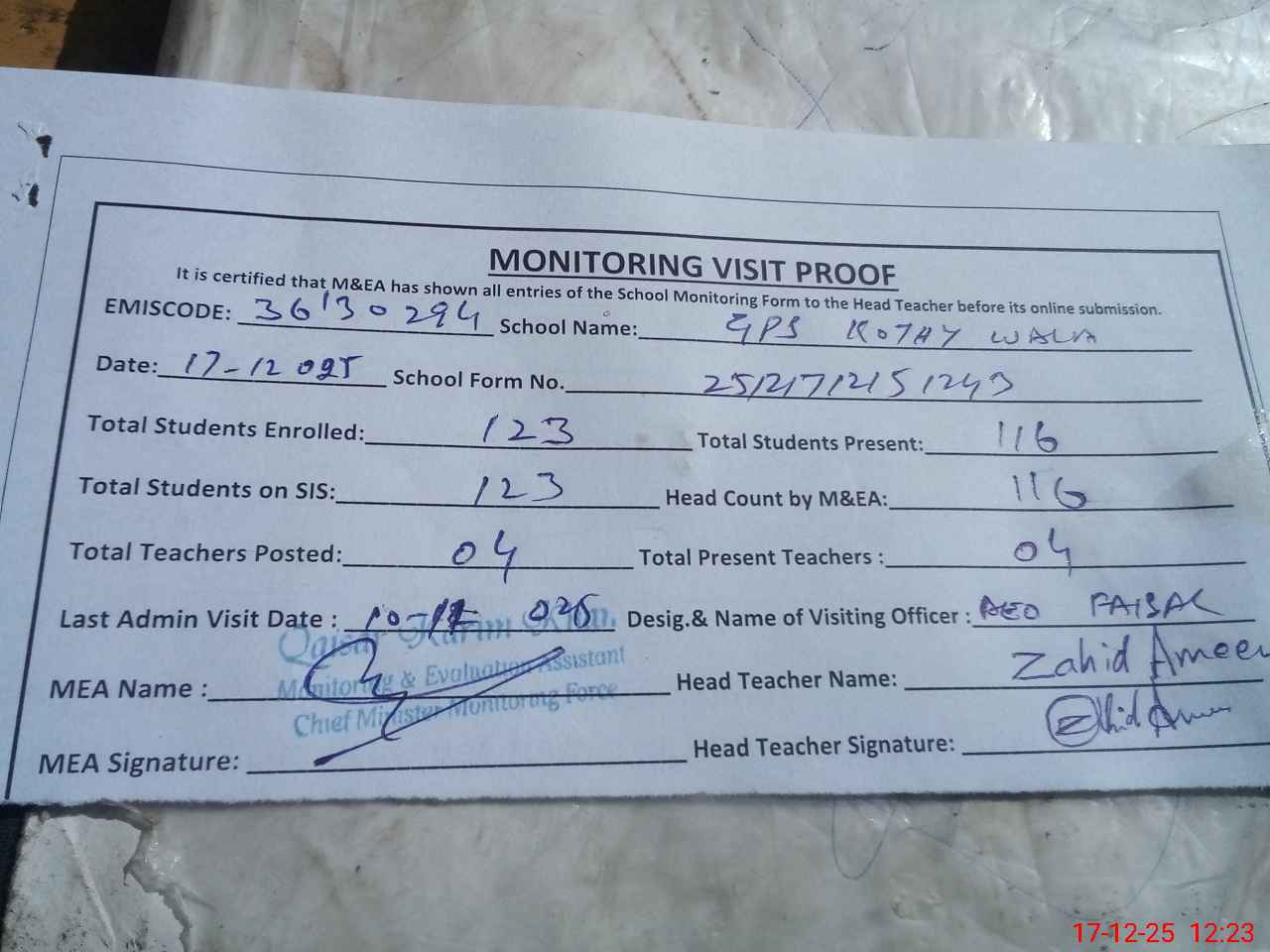 | EMIS Code: 36130294 | Name of School: GPS KOTHEY WALA NO.1 MOZA KOTHI WALA P/O SAME | |||
