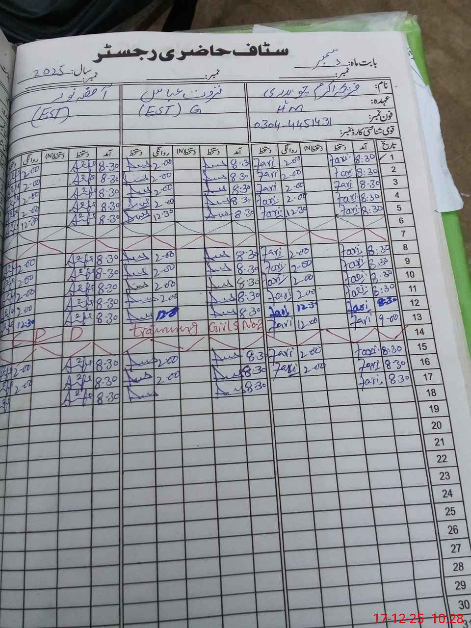 | CNIC | Full Name | Designation | R/C | Absence During Last Calender Month |