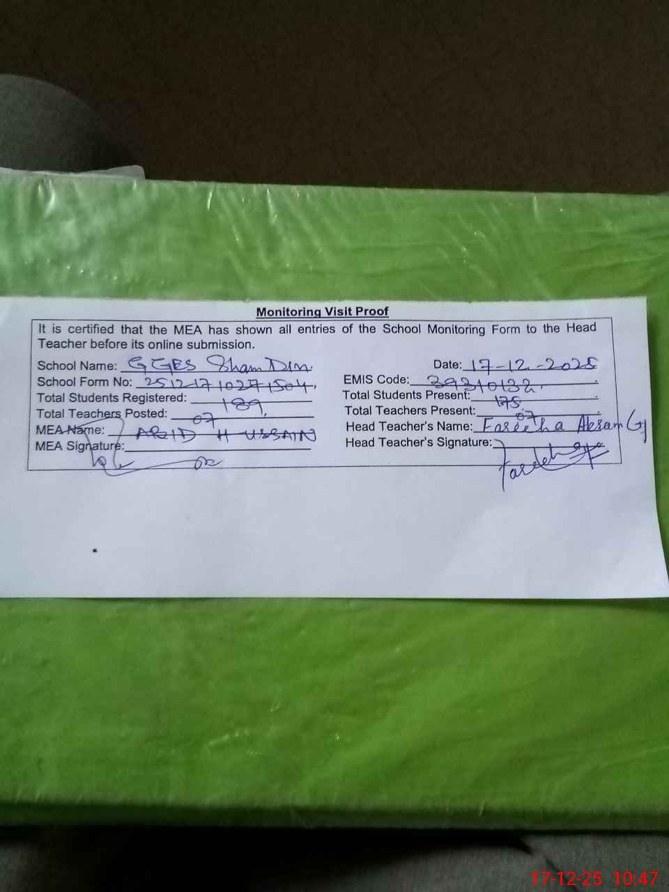 | Attendance Register | Head Teacher | MEA with School | Visit Proof |