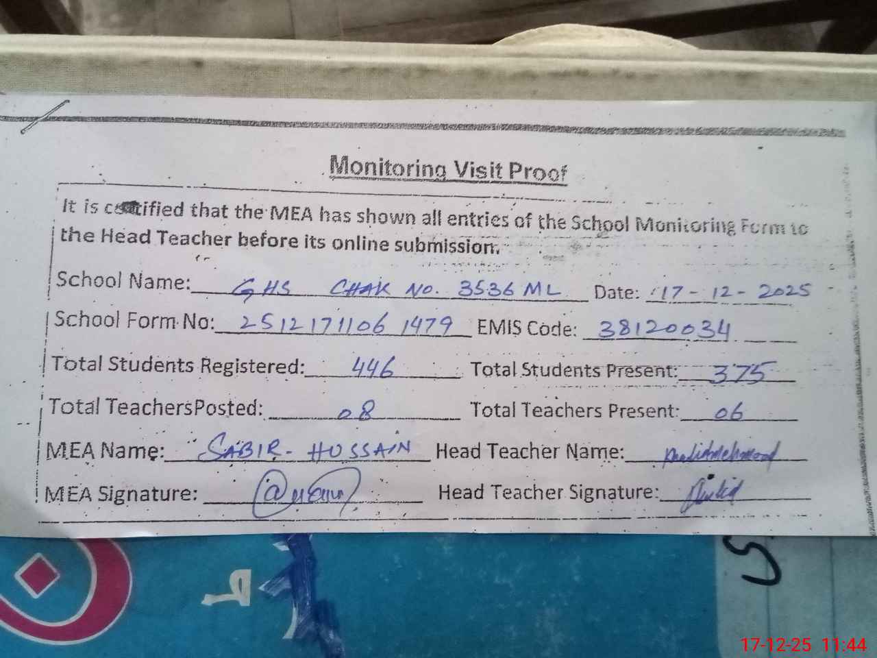 | Attendance Register | Head Teacher | MEA with School | Visit Proof |