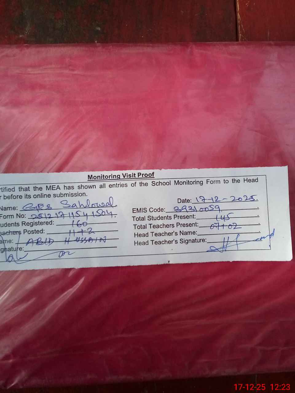 | Attendance Register | Head Teacher | MEA with School | Visit Proof |