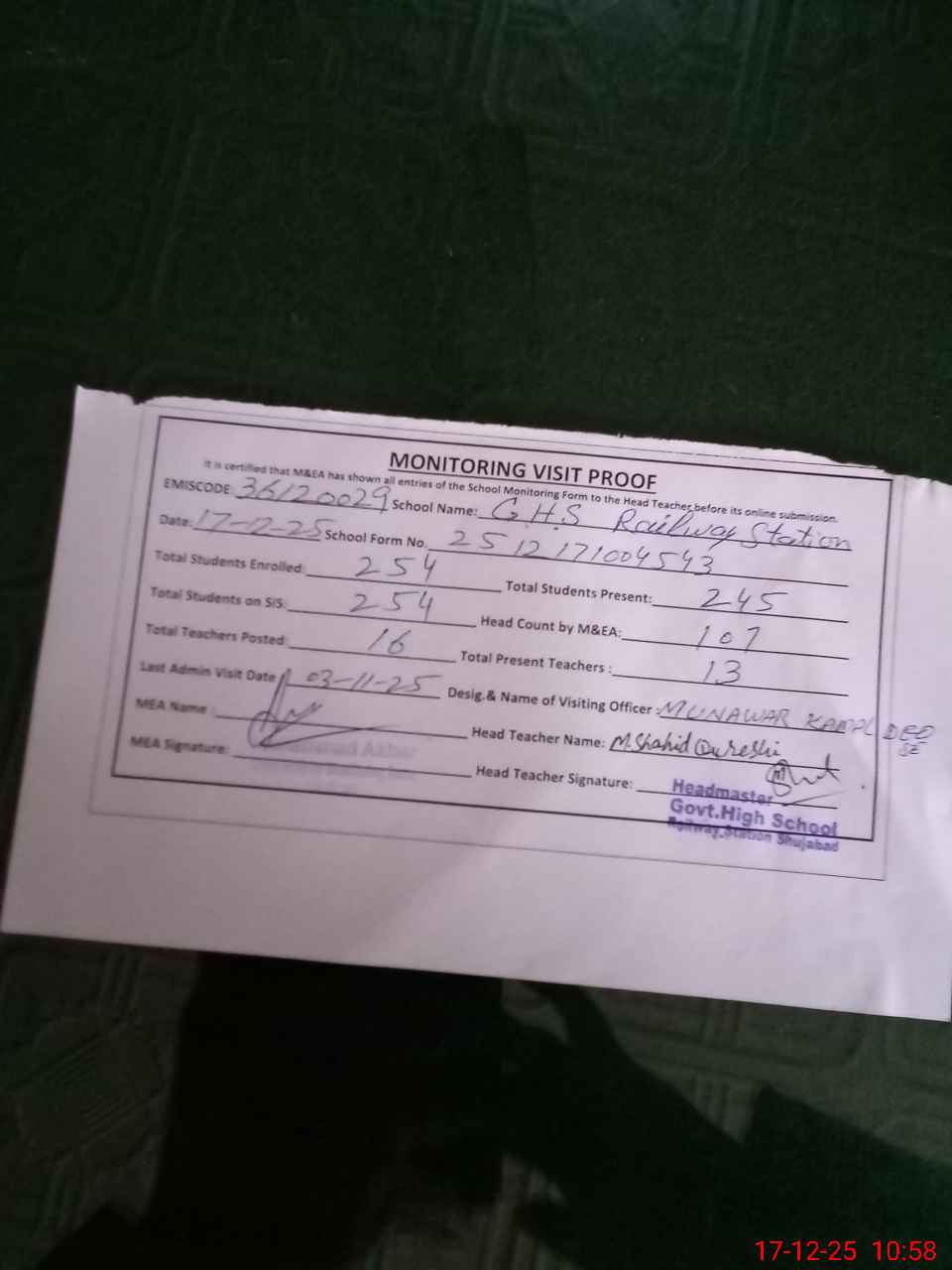 | EMIS Code: 36120029 | Name of School: GHS RAILWAY STATION SHUJABAD | |||