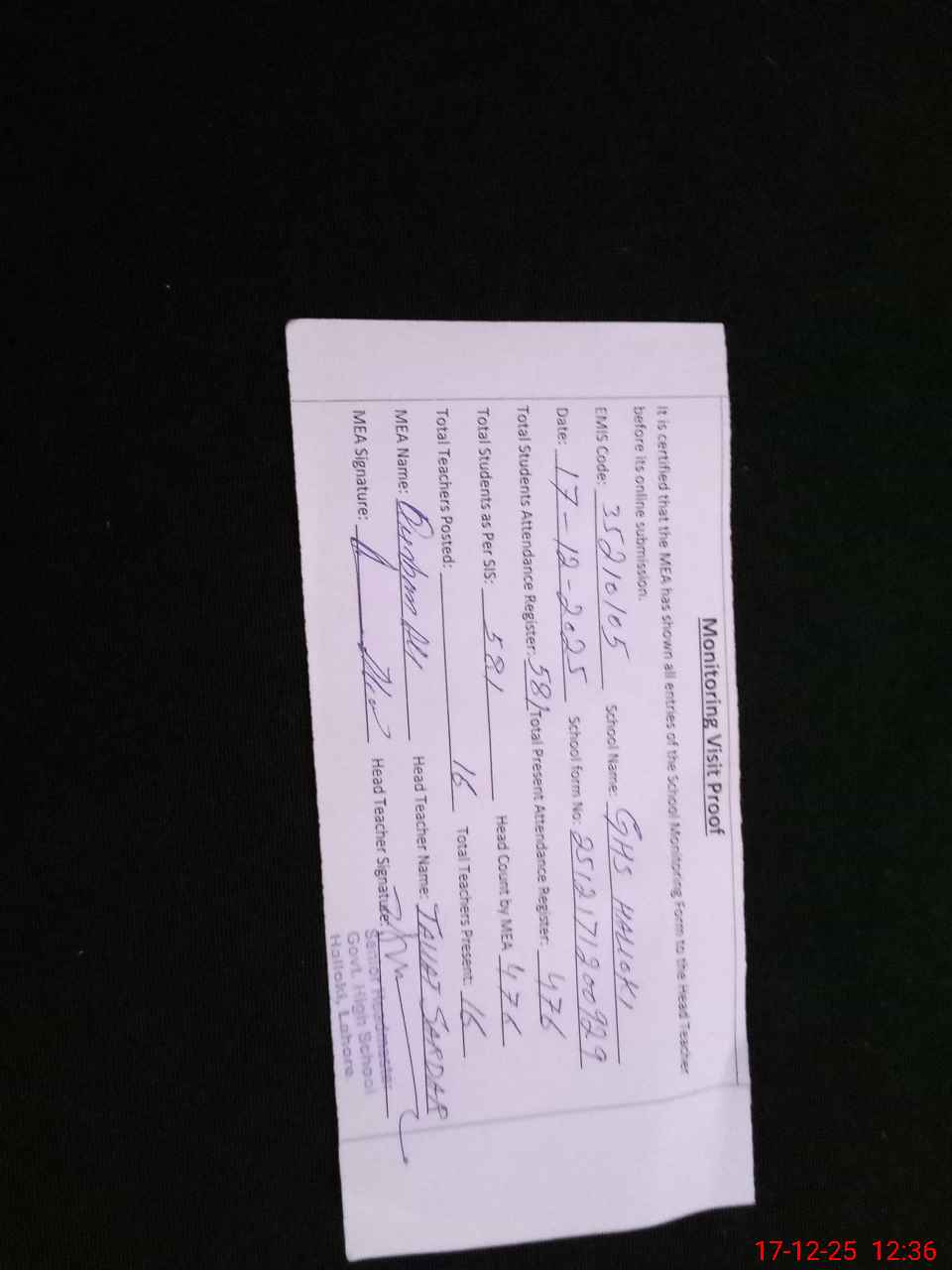 | Attendance Register | Head Teacher | MEA with School | Visit Proof |