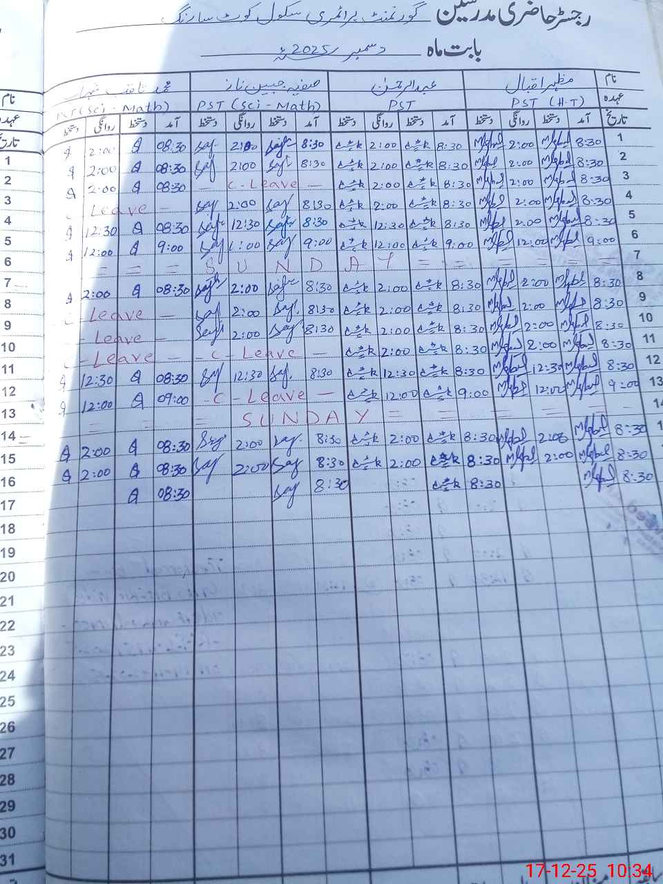 | CNIC | Full Name | Designation | R/C | Absence During Last Calender Month |