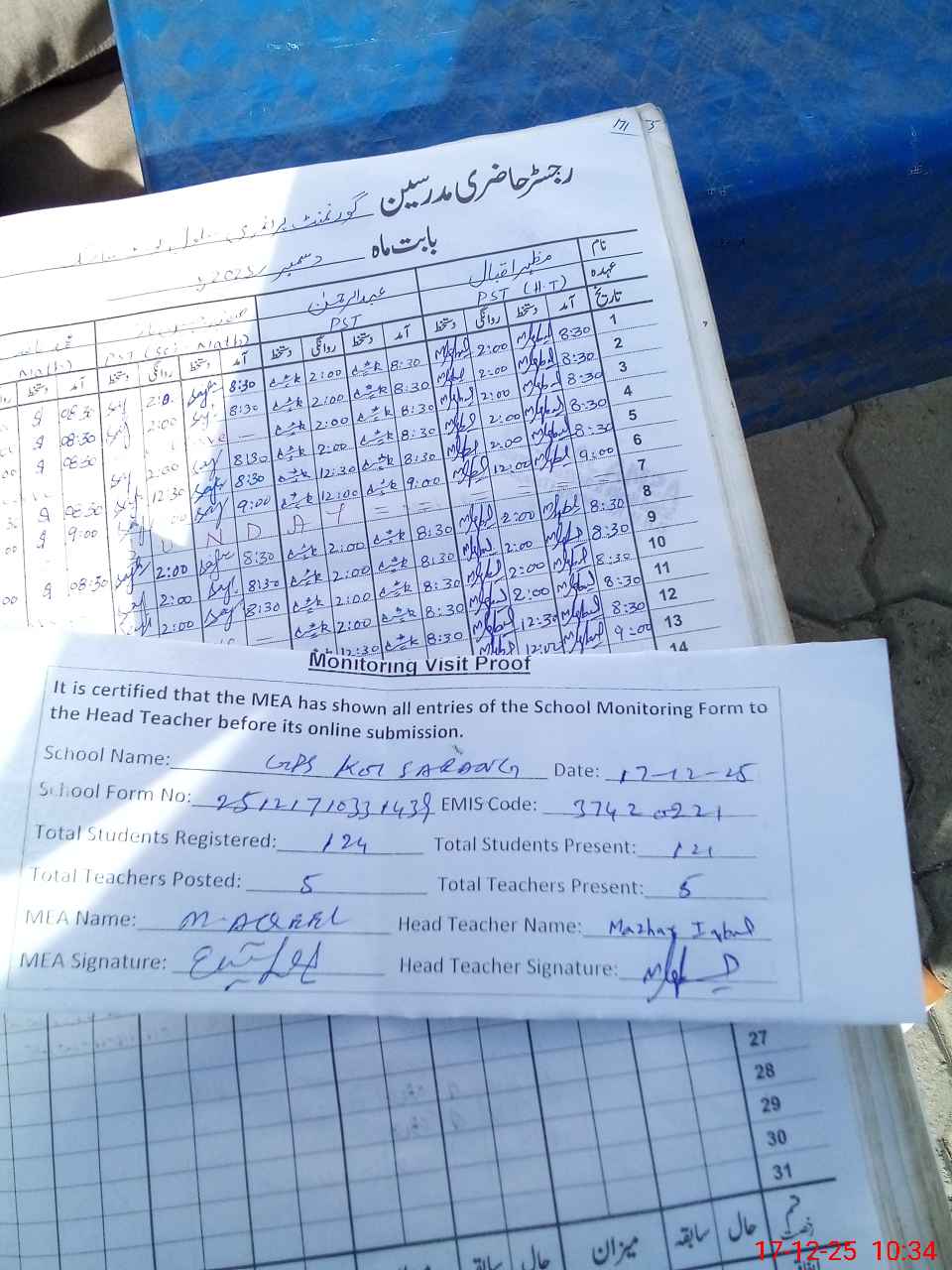 | Attendance Register | Head Teacher | MEA with School | Visit Proof |