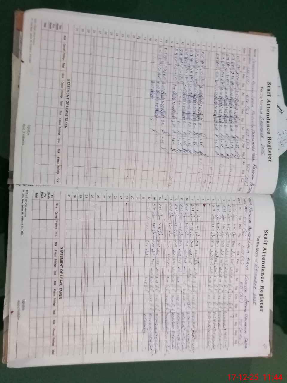| CNIC | Full Name | Designation | R/C | Absence During Last Calender Month |