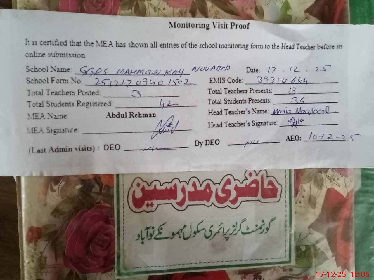 | Attendance Register | Head Teacher | MEA with School | Visit Proof |