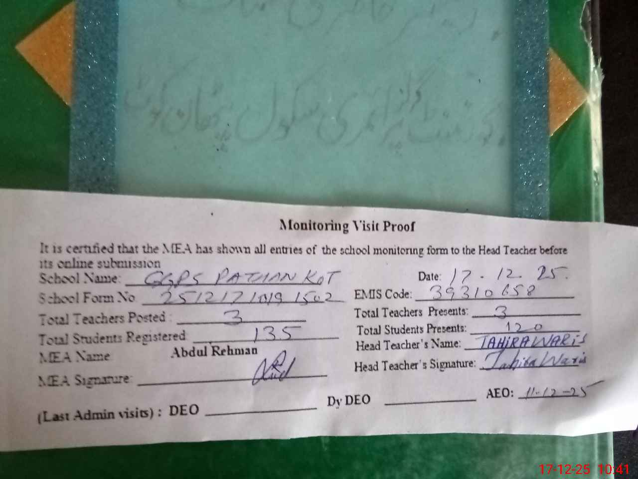 | Attendance Register | Head Teacher | MEA with School | Visit Proof |