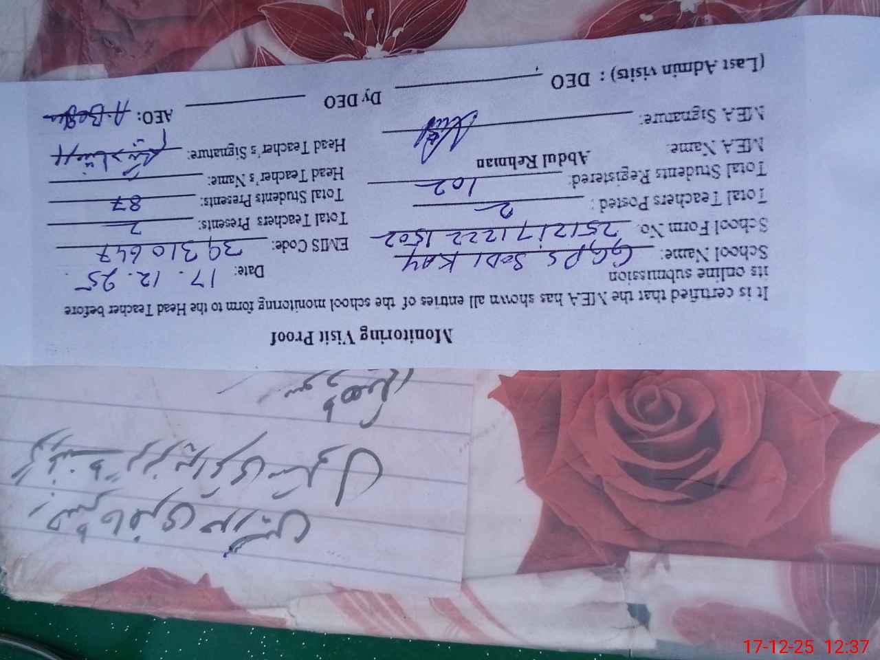 | Attendance Register | Head Teacher | MEA with School | Visit Proof |