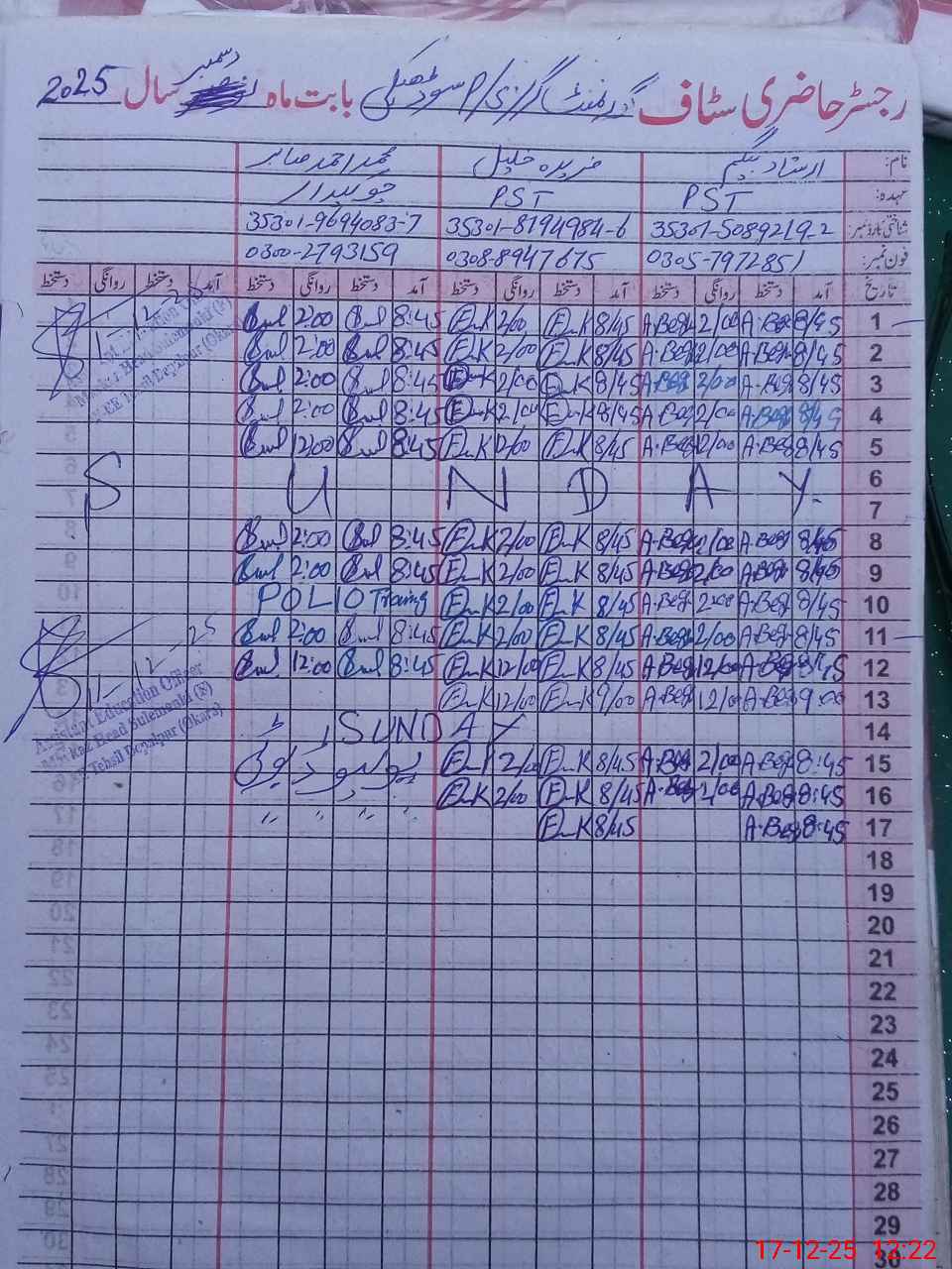| CNIC | Full Name | Designation | R/C | Absence During Last Calender Month |