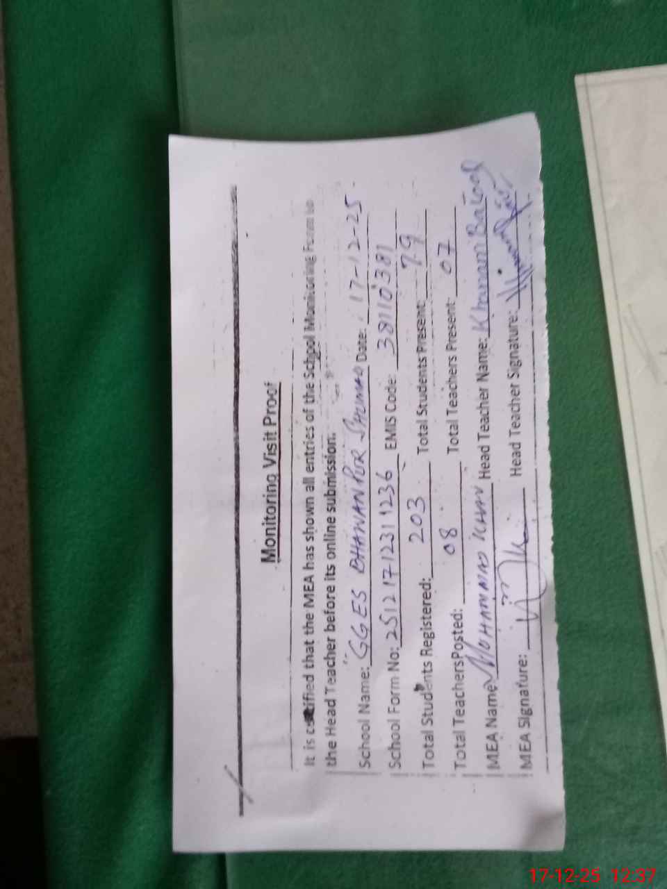 | Attendance Register | Head Teacher | MEA with School | Visit Proof |