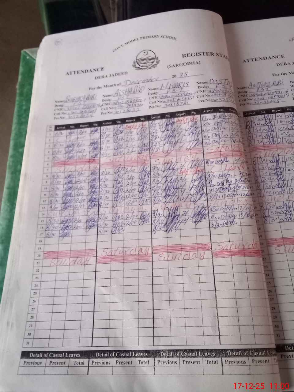 | CNIC | Full Name | Designation | R/C | Absence During Last Calender Month |