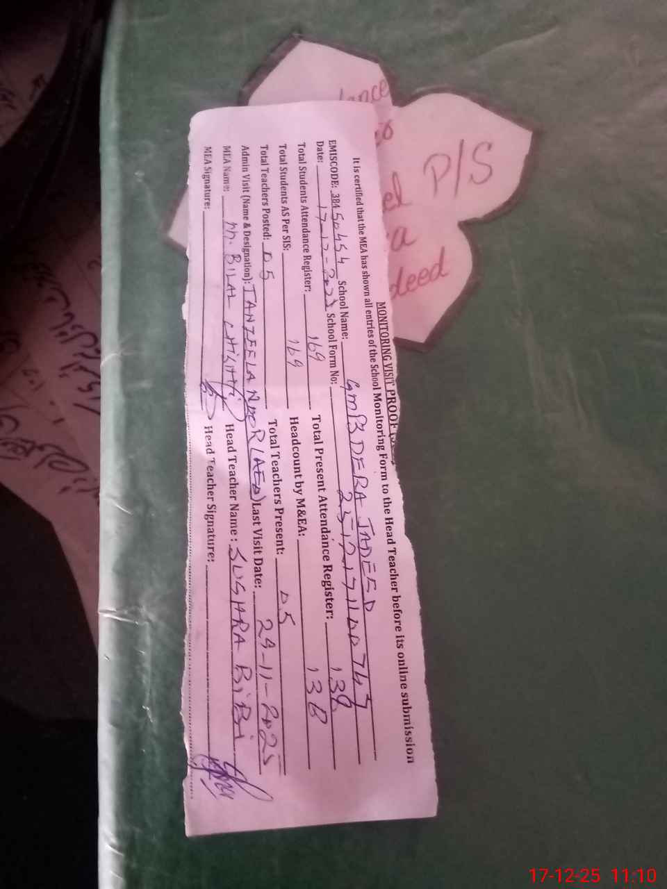 | Attendance Register | Head Teacher | MEA with School | Visit Proof |