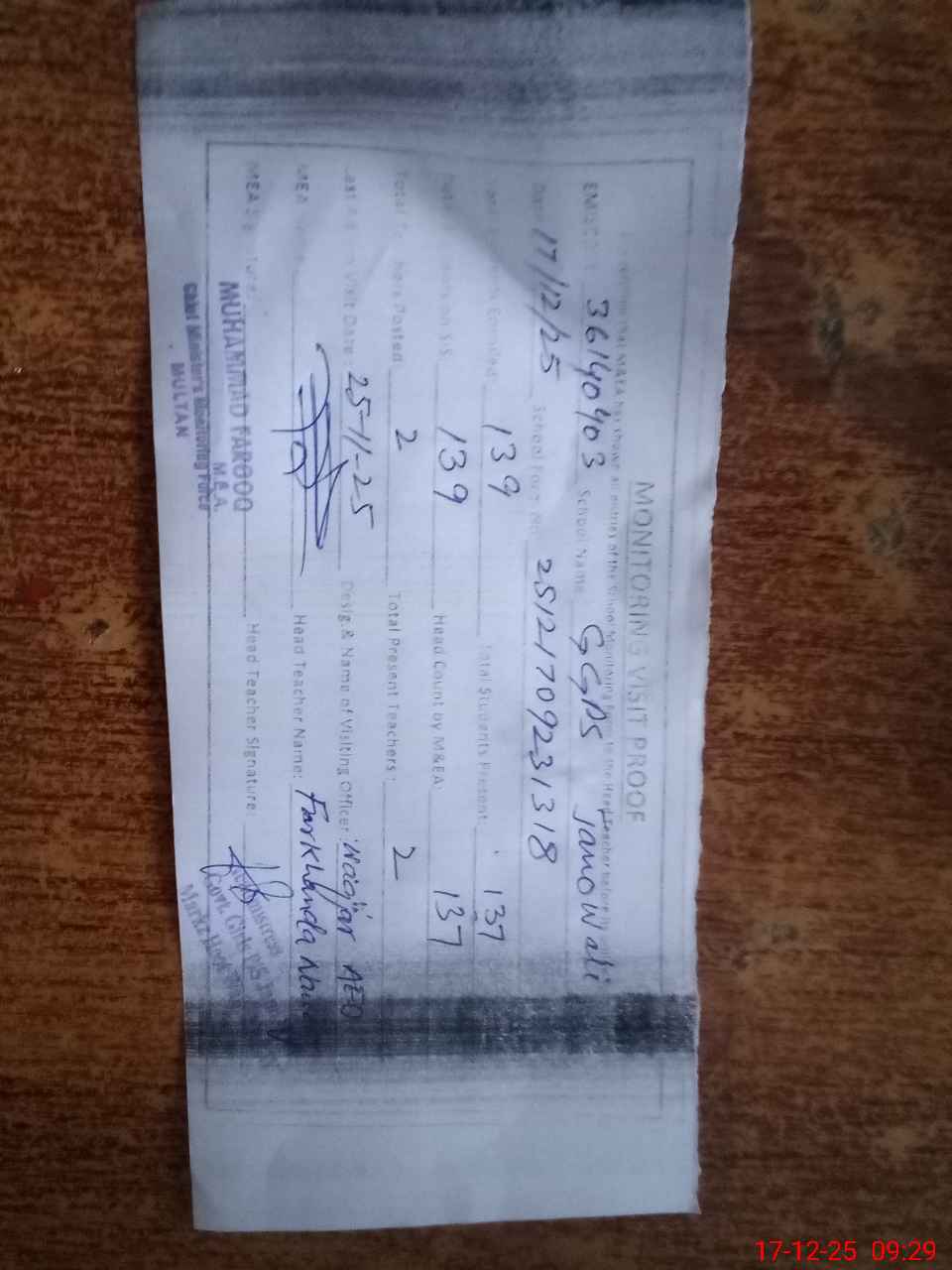 | Attendance Register | Head Teacher | MEA with School | Visit Proof |