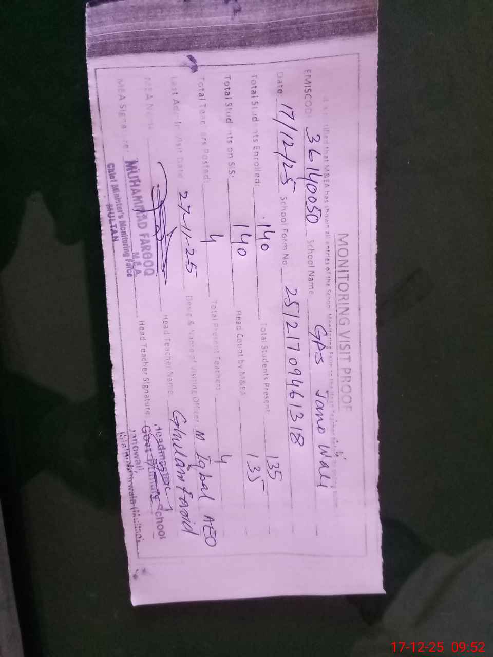 | Attendance Register | Head Teacher | MEA with School | Visit Proof |