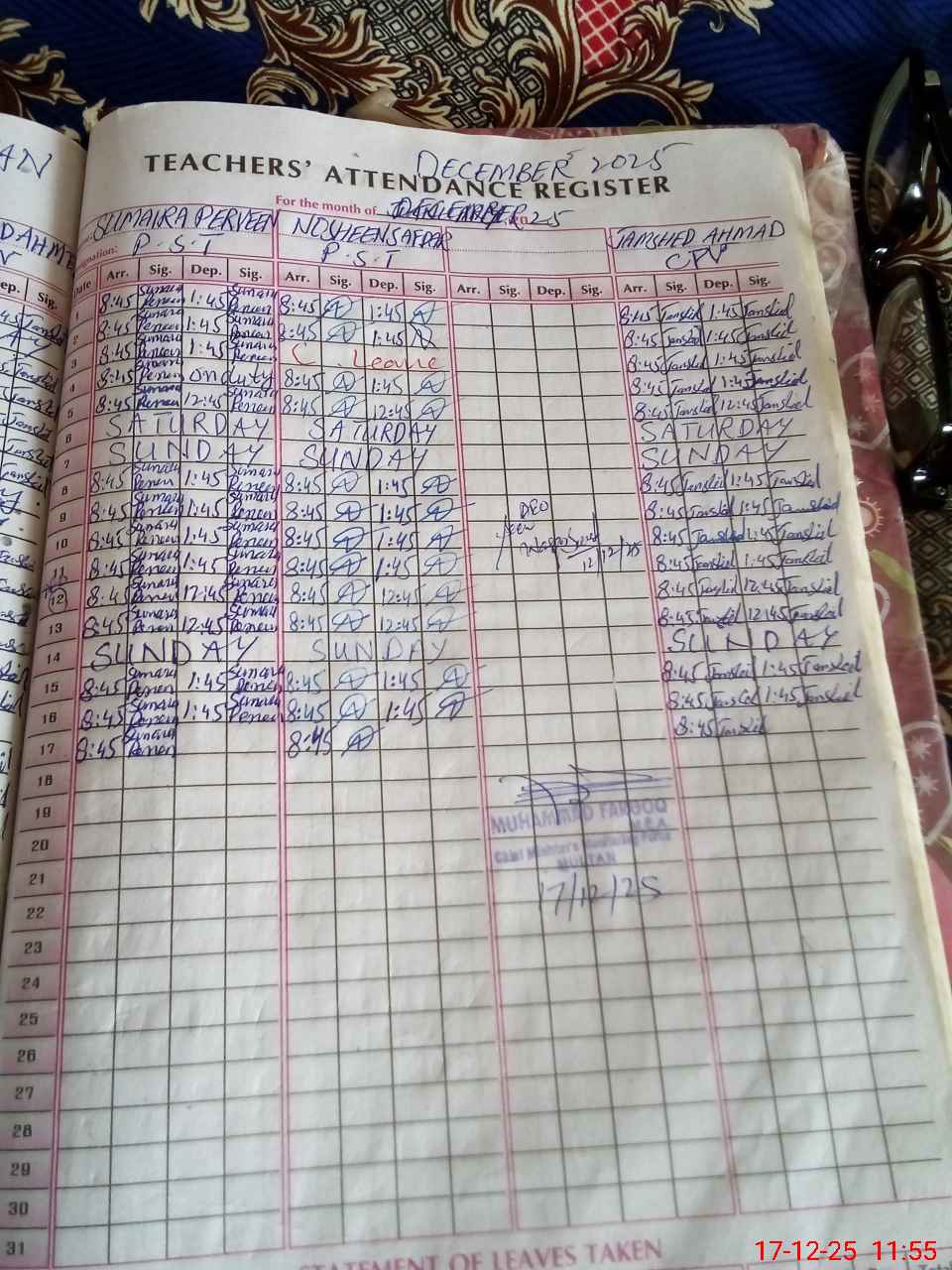 | CNIC | Full Name | Designation | R/C | Absence During Last Calender Month |