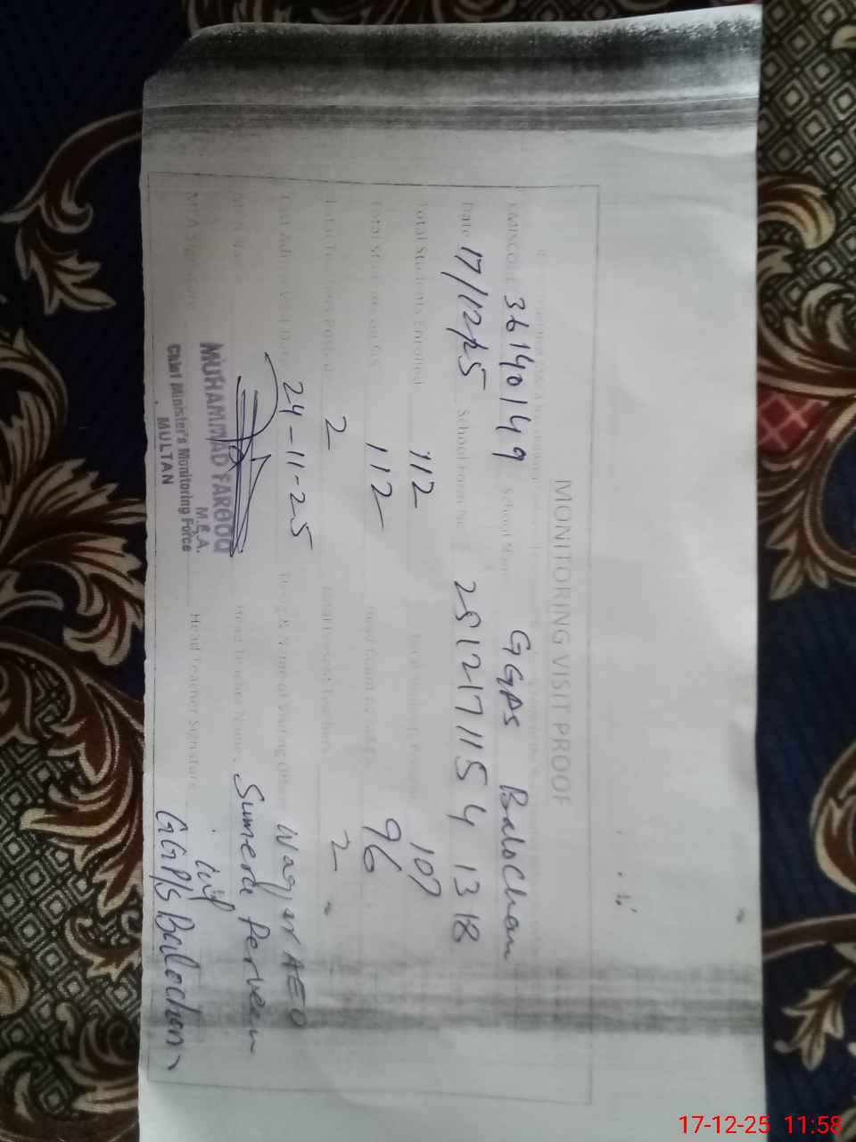 | Certified that this School was Inspected by the Undersigned MEA/DMO Today and the Information Stated Above is as Per Record. | |||||