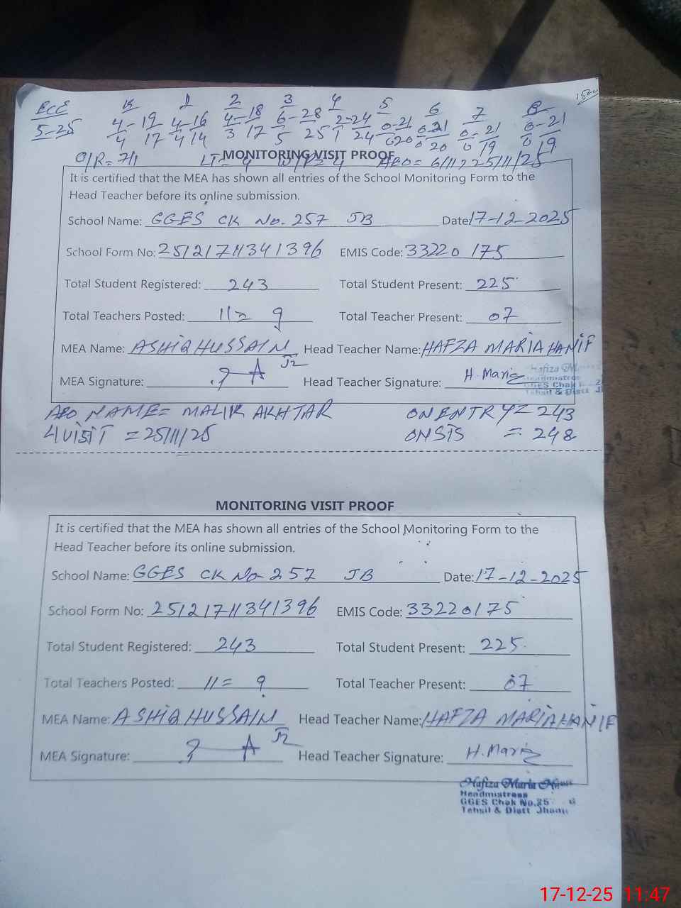 | EMIS Code: 33220175 | Name of School: GGES CHAK NO 257 JB | |||